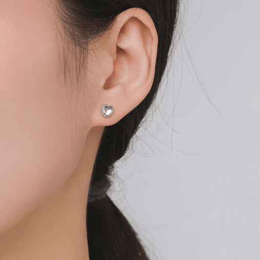 Moonstone Heart Stud Earrings — Sterling Silver Blue Heart